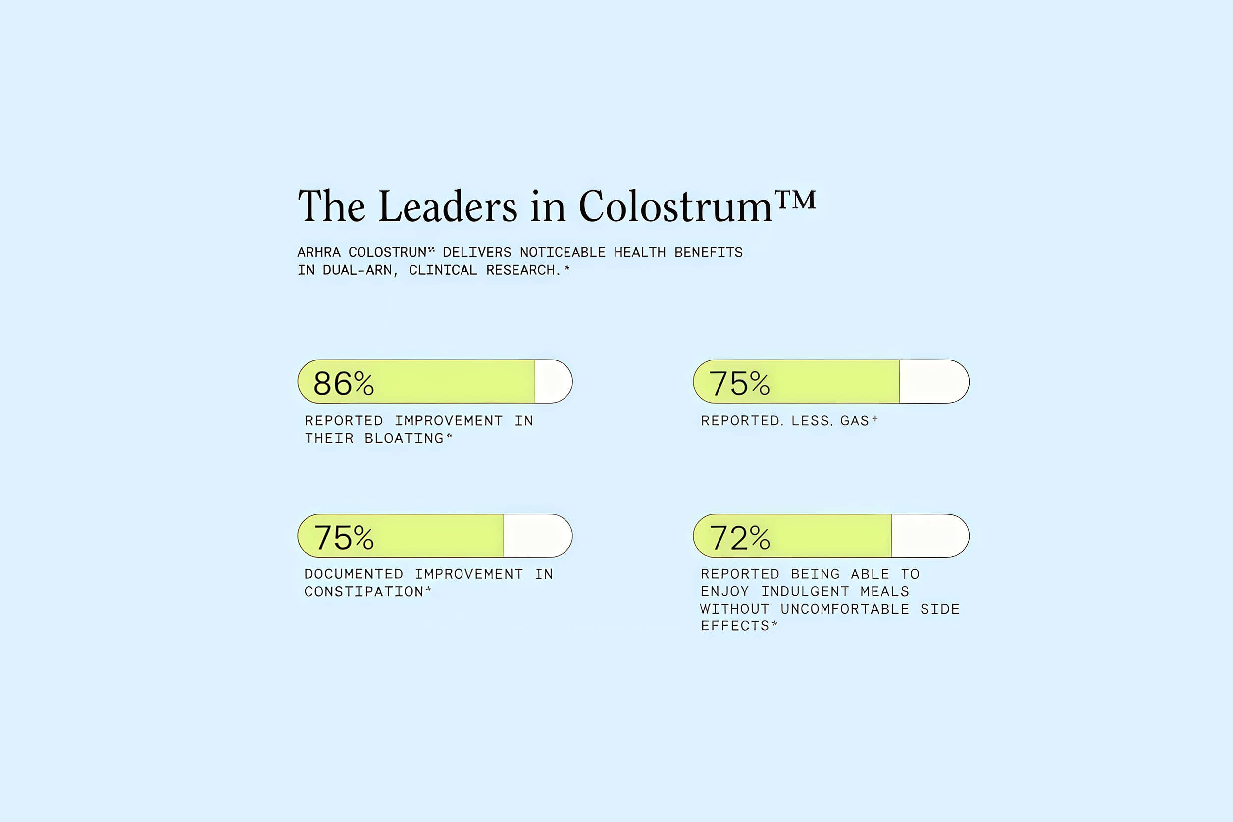At ARMRA®, we stand by our commitment to safety, transparency, and scientific rigor. While thousands of published studies document the benefits of bovine colostrum and itsability to promote healthat all stages of life, ARMRA Colostrum™ delivers noticeablehealth benefitsin dual-arm, clinical research.